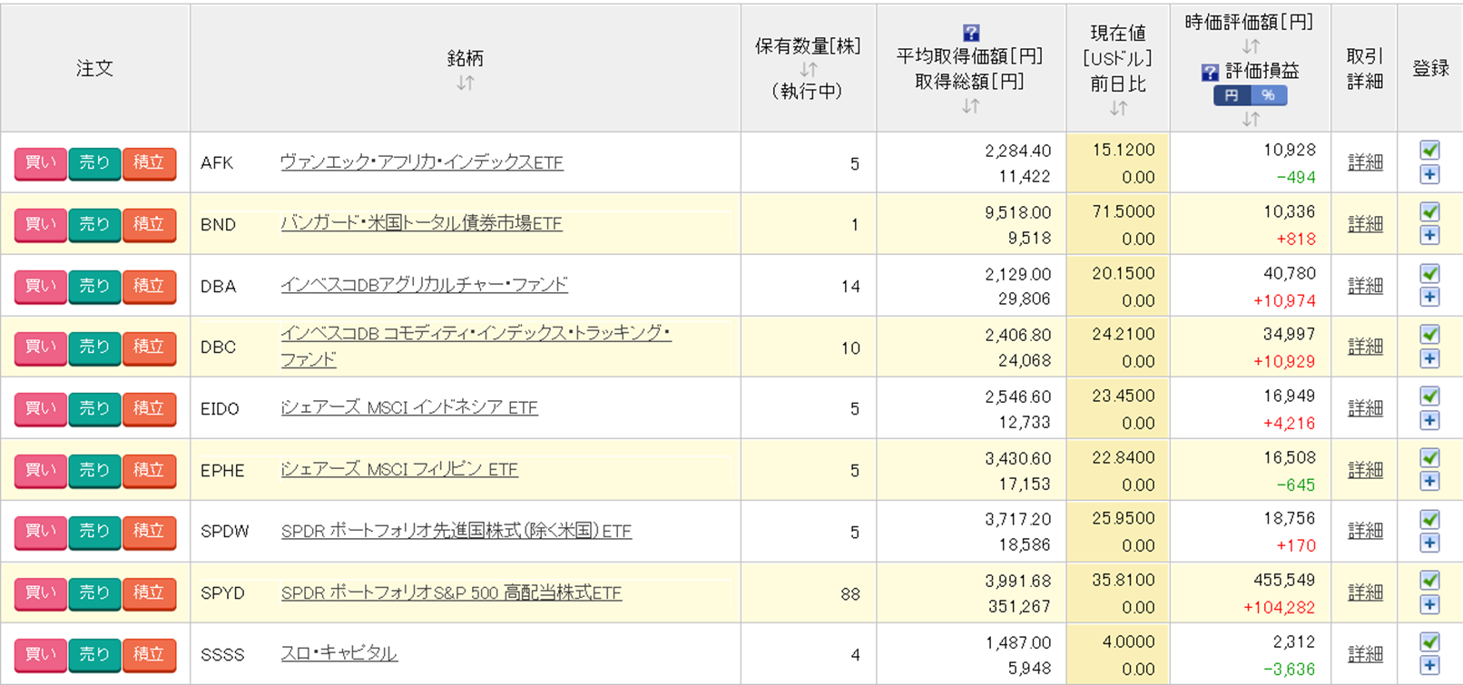 楽天証券の米国株のほとんどはSPYDです。(あくまで配当目当てですが。)含み益も出る上に、さらに配当もあれば気持ち的にはかなり安心です。私が運用している中で一番愛着があり、頑張ってほしいのがSPYDです。ETFの中で一番最初に購入を始めたものでもあります。