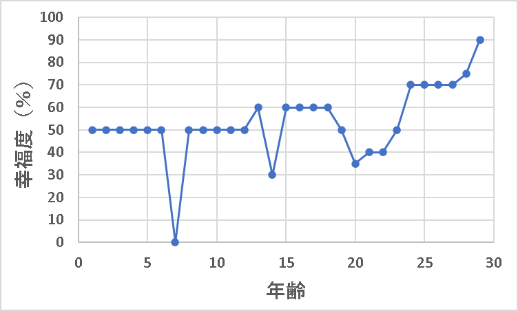 突然ですが、私の人生の幸福度のグラフを作成してみました。(平均的なところを50%とします。)