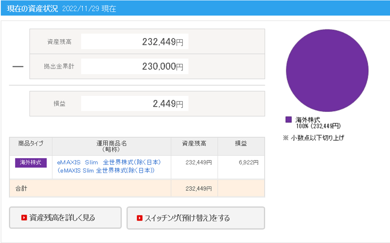 iDeCoについては、上限の月23,000円の積み立てとなります。こちらは、入れたら引き出すこともできないので、この月に1回の振り返り以外で、ほとんどログインすらせずに完全放置の状況です。