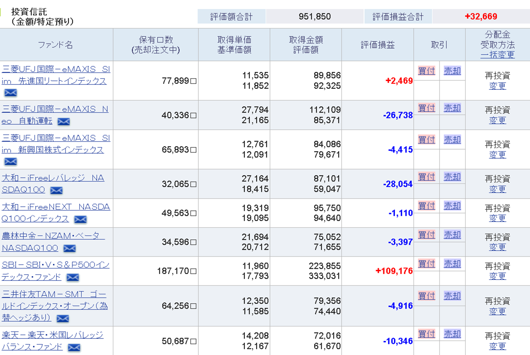 そして毎日積み立て額については、iFreeレバ:250円、先進国REIT:200円、自動運転:350円、新興国株:200円、iFreeNEXT:250円、農林中金:250円、ゴールド:200円、SBIバンガード:250円、USA360:250円としています。