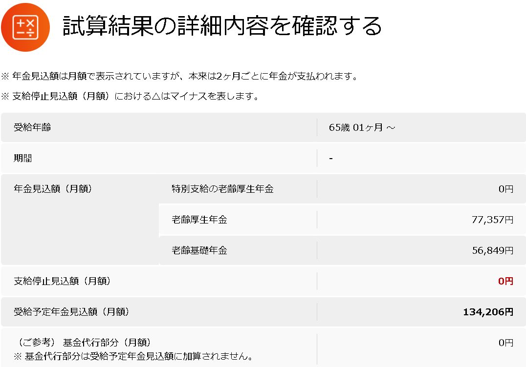 例えば、私の場合ですが、現在の収入が続くと仮定して60歳まで働き、65歳から年金を受け取ると仮定して、年金定期便やねんきんネットなどで簡易計算をすると以下のようになります。(皆さんも一度計算してみてください。)