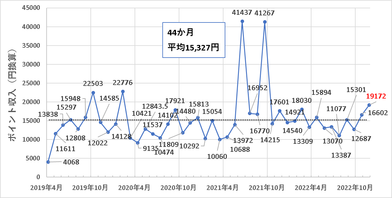 というわけで、2019年5月(月途中から始めたため参考データ)、2020年4月以外の42か月間において、月間10,000円分以上のポイント獲得を達成しています。