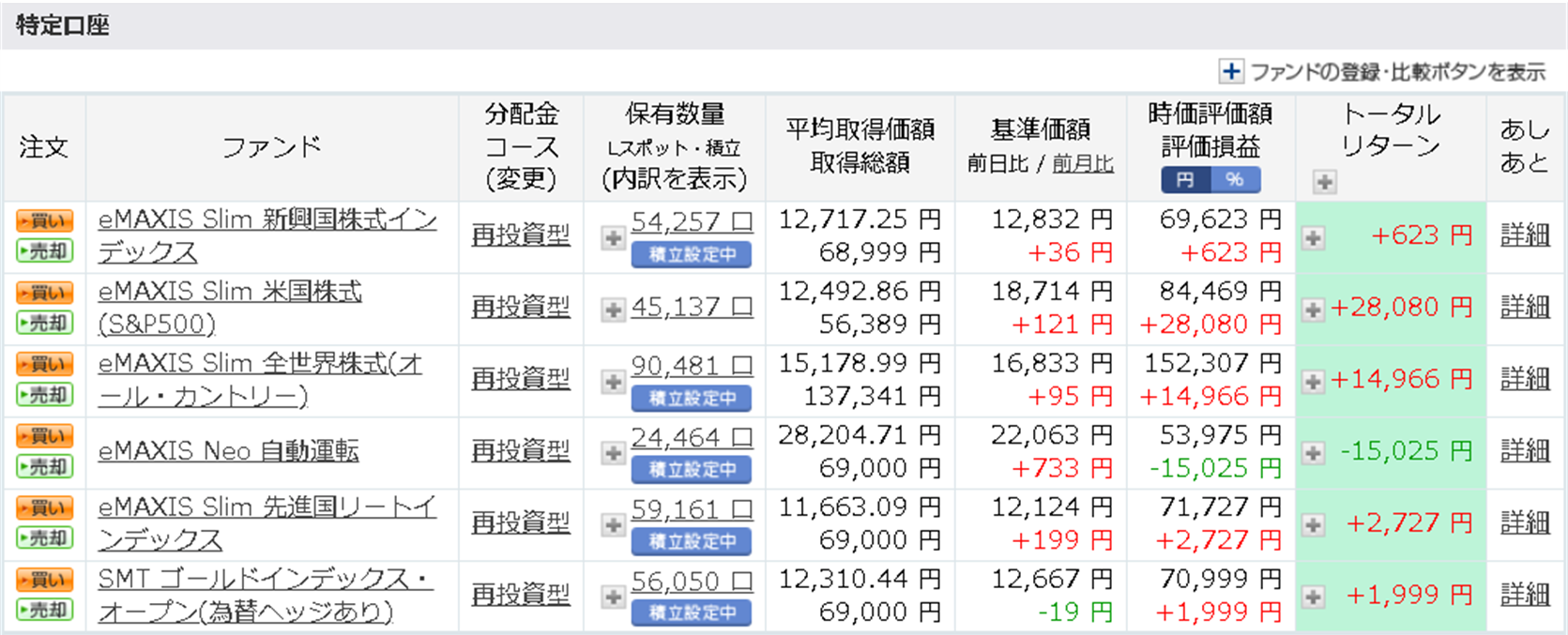 メインは積み立てNISAでしたが、さらに追加で楽天証券の投資信託の(クレカ決済→楽天キャッシュ)1%ポイント還元の上限の5万円/月と、SBI証券でも約5万円/月(こちらは毎日積み立て)の合計約10万円/月を基本の追加運用資金としてコツコツ続けています。
