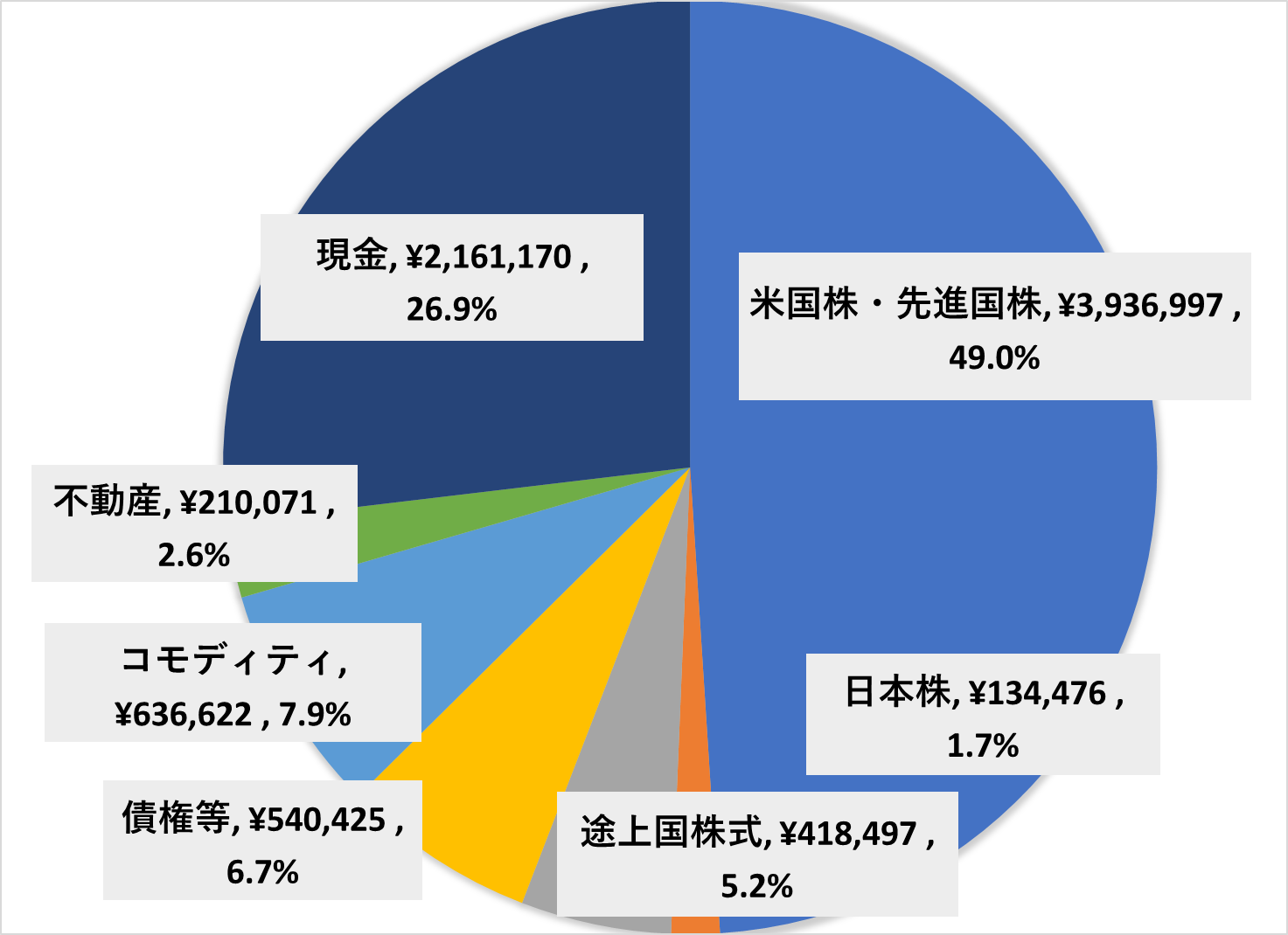 基本的に現金は、最低限で生活防衛資金である6か月分の生活費(約13万円/月×6 = 約80万円)を残しておくことを守って、それ以外はリスク資産に変えていきたいとは考えているので、毎月コツコツと途上国株式や債券、コモディティの購入を進めていきます。