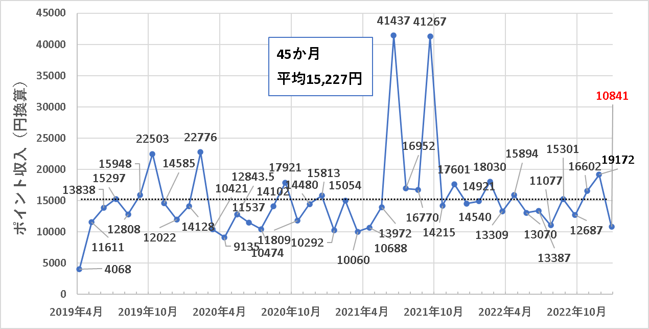 というわけで、2019年5月(月途中から始めたため参考データ)、2020年4月以外の42か月間において、月間10,000円分以上のポイント獲得を達成しています。