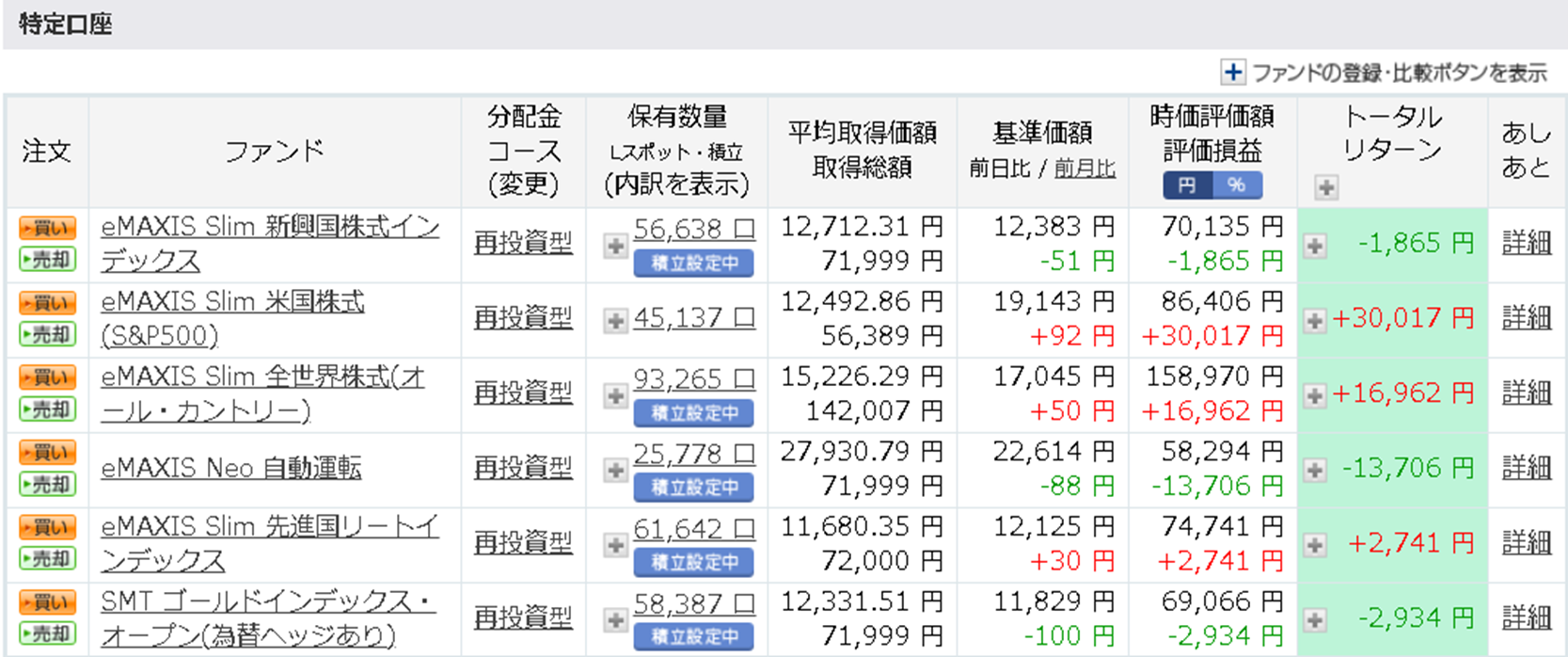 メインは積み立てNISAでしたが、さらに追加で楽天証券の投資信託の(クレカ決済→楽天キャッシュ)1%ポイント還元の上限の5万円/月と、SBI証券でも約5万円/月(こちらは毎日積み立て)の合計約10万円/月を基本の追加運用資金としてコツコツ続けています。
