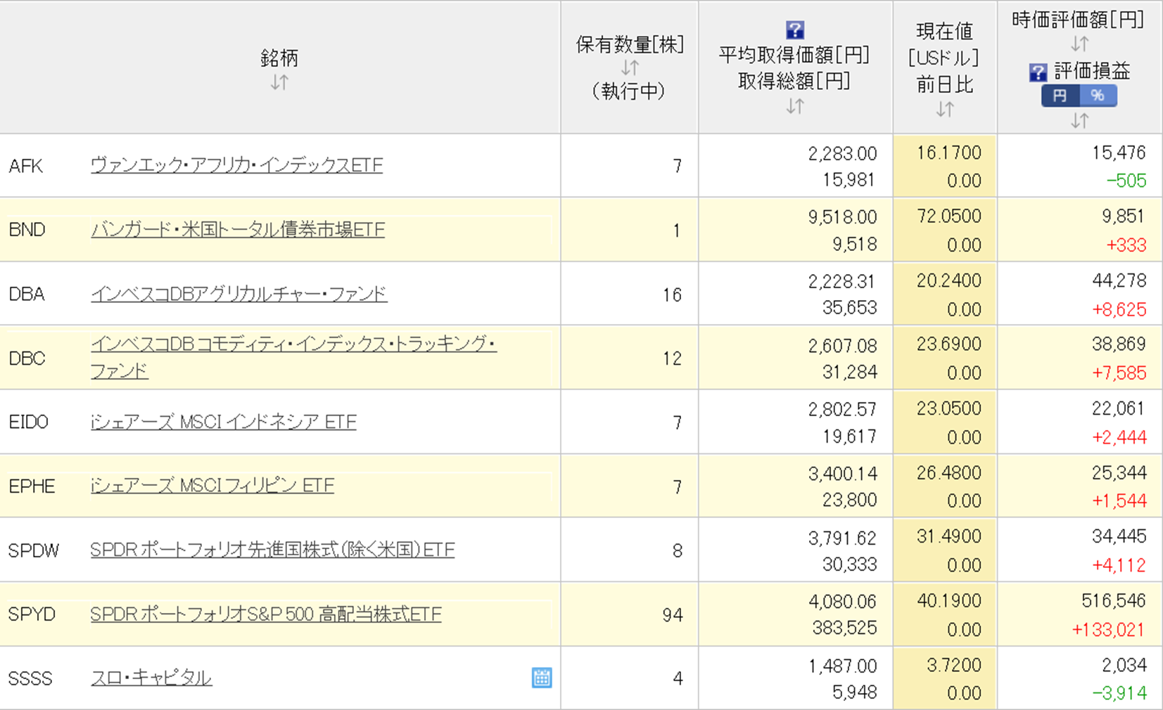 楽天証券の米国株のほとんどはSPYDです。(あくまで配当目当てですが。)含み益も出る上に、さらに配当もあれば気持ち的にはかなり安心です。私が運用している中で一番愛着があり、頑張ってほしいのがSPYDです。ETFの中で一番最初に購入を始めたものでもあります。