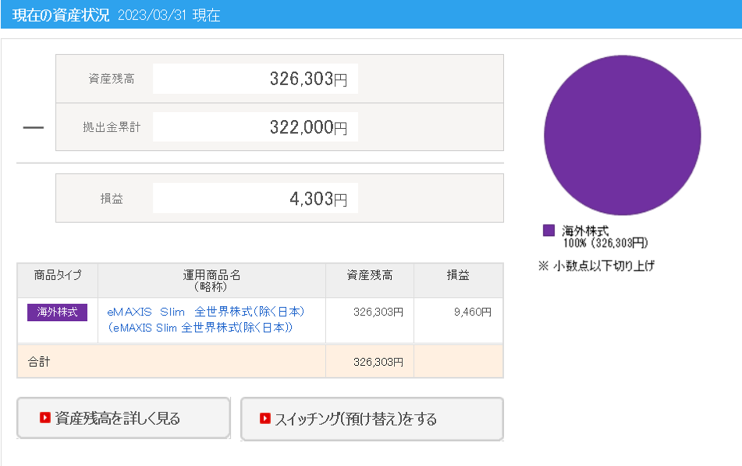 iDeCoについては、「日本を除く全世界株」を会社員の上限の月23,000円の積み立てとなります。こちらは、入れたら引き出すこともできないので、この月に1回の振り返り以外で、ほとんどログインすらせずに完全放置の状況です。