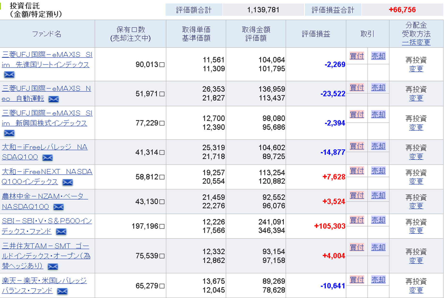 マイナスにマイナスを積み上げてていた、レバナス、自度運転、レババラ達が回復して、さらにゴールドもマイナス圏からプラス圏に転じたことで全体としてプラスになりました。その調子で、マイナスを解消してほしいところです。