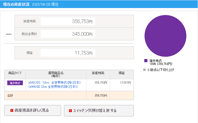 iDeCoについては、「日本を除く全世界株」を会社員の上限の月23,000円の積み立てとなります。こちらは、入れたら引き出すこともできないので、この月に1回の振り返り以外で、ほとんどログインすらせずに完全放置の状況です。