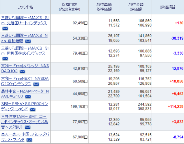 そして毎日積み立て額については、iFreeレバ:250円、先進国REIT:200円、自動運転:350円、新興国株:200円、iFreeNEXT:250円、農林中金:250円、ゴールド:200円、SBIバンガード:250円、USA360:250円としています。