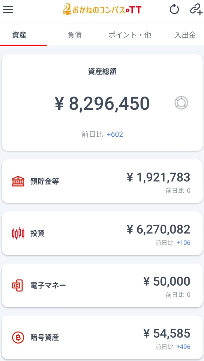 基本的に、上記のデータは前月最終日時点の価格を元に記事を作成していますが、タイトル上では更新日の〇月2日時点ということになります。ということで、集計時と記事の投稿日がどうしてもズレてしまうのですが、状況把握のためであればアプリで示すのもアリなのかということで、「お金のコンパス」を利用してみることにしました。