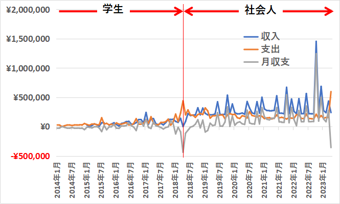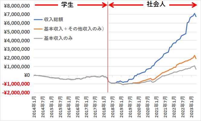 学生時代は、少しずつマイナスが積みあがっていくような形で、途中プラマイゼロ付近まで戻しつつも、最終的にマイナス100万円ほどとなりました。肝となるのは社会人に入ってから!