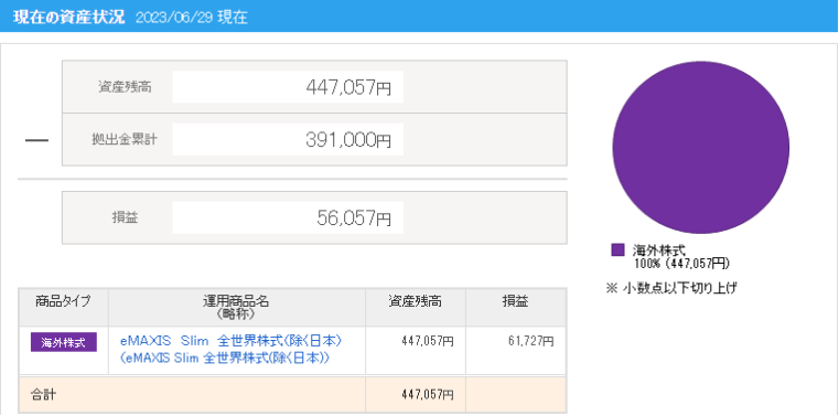 iDeCoについては、「日本を除く全世界株」を会社員の上限の月23,000円の積み立てとなります。こちらは、入れたら引き出すこともできないので、この月に1回の振り返り以外で、ほとんどログインすらせずに完全放置の状況です。