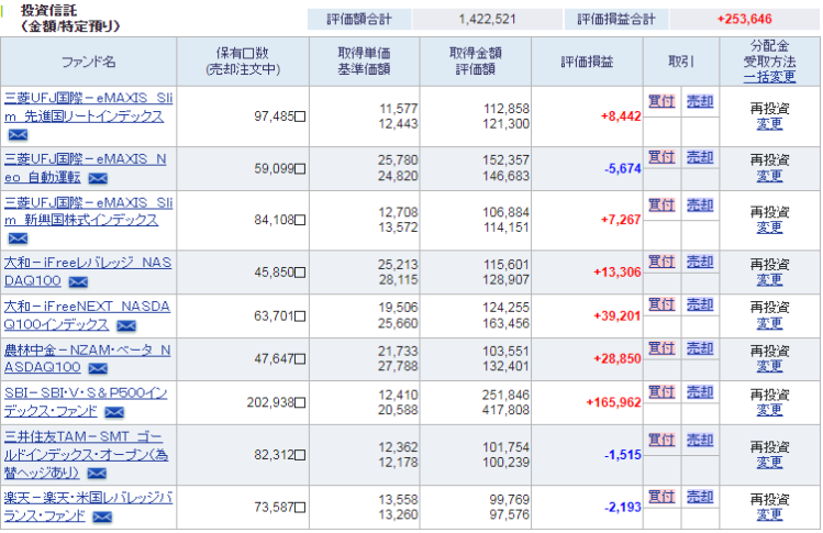そして毎日積み立て額については、iFreeレバ:250円、先進国REIT:200円、自動運転:350円、新興国株:200円、iFreeNEXT:250円、農林中金:250円、ゴールド:200円、SBIバンガード:250円、USA360:250円としています。