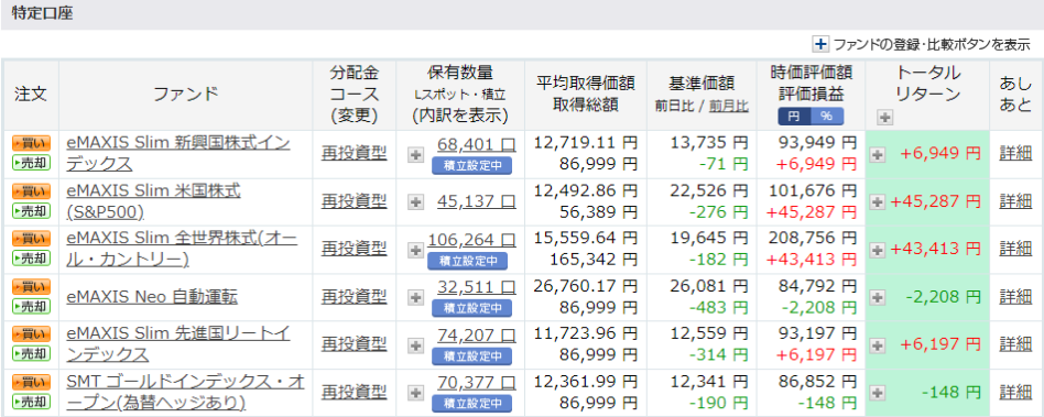メインは積み立てNISAでしたが、さらに追加で楽天証券の投資信託の(クレカ決済→楽天キャッシュ)0.5%ポイント還元の上限の5万円/月と、SBI証券でも約5万円/月(こちらは毎日積み立て)の合計約10万円/月を基本の追加運用資金としてコツコツ続けています。