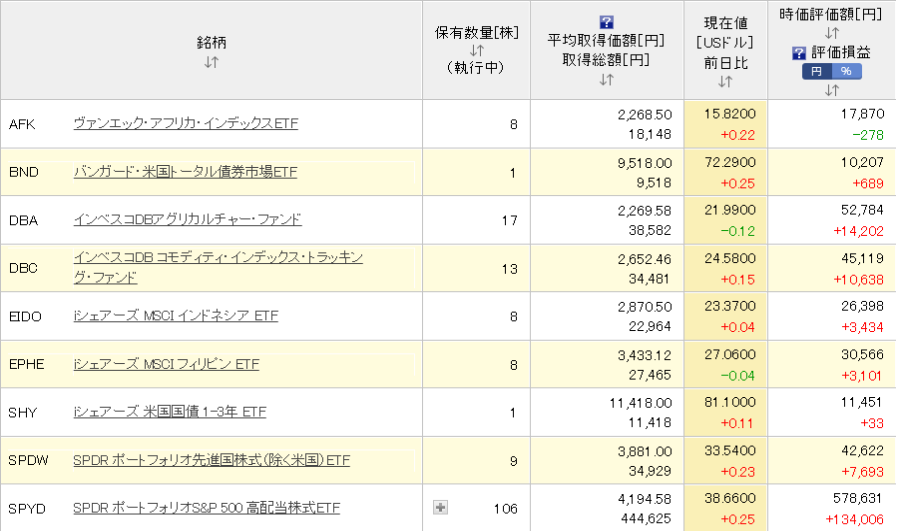 楽天証券の米国株のほとんどはSPYDです。(あくまで配当目当てですが。)含み益も出る上に、さらに配当もあれば気持ち的にはかなり安心です。私が運用している中で一番愛着があり、頑張ってほしいのがSPYDです。ETFの中で一番最初に購入を始めたものでもあります。