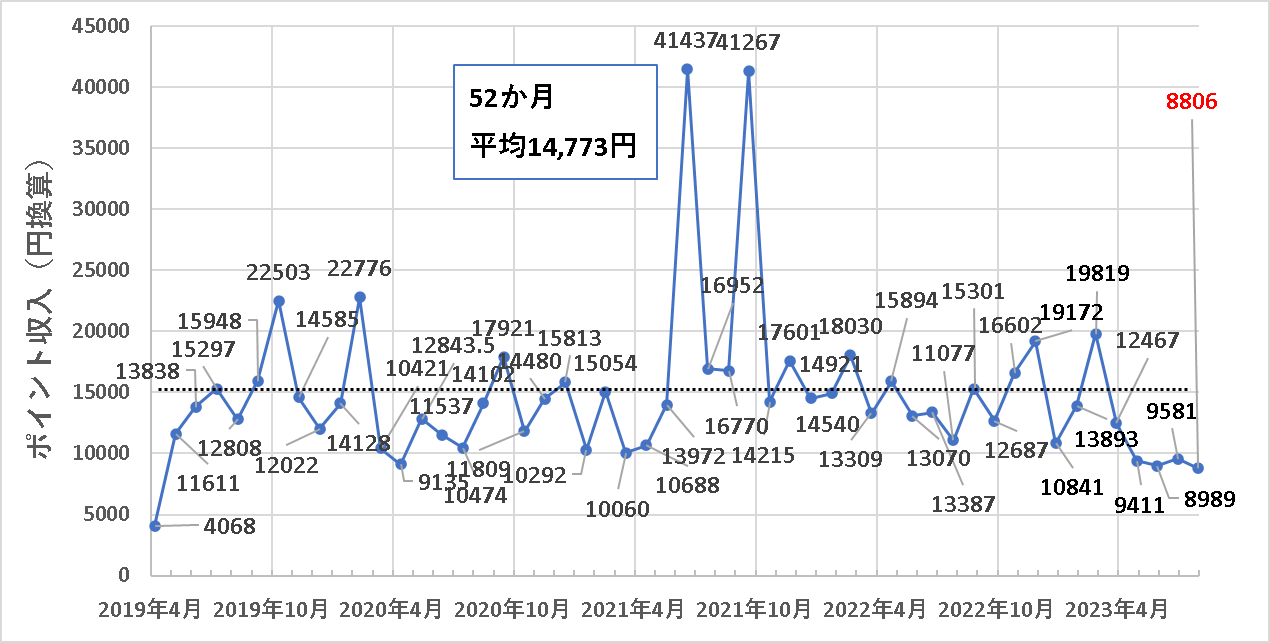 というわけで、2019年5月(月途中から始めたため参考データ)、2020年4月以外、2023年5~8月の46か月間において、月間10,000円分以上のポイント獲得を達成しています。