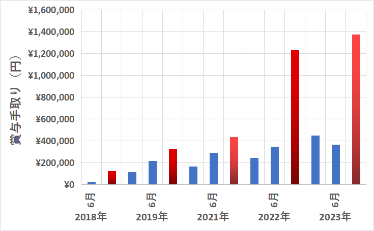 前回の6月賞与と比較すると大幅上昇となりましたが、前年同期比で約14万円上がっていましたね。(昨年同期比で+12%でした!)