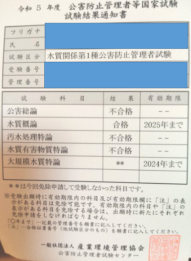 さて、話は資格に戻りまして、せっかく資格を取るなら業務にも関連するようなものが良いということで、「公害防止管理者試験」を2022年、2023年の10月頭に受験しました。先日、その結果が戻ってきましたので、過去記事にてお約束?した通り噓偽りなく報告したいと思います。