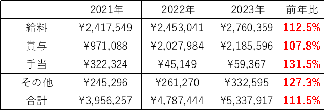 昨年から50万円以上増えてくれました!毎月の手取り収入アップと賞与も順調に増えたということで、10%以上の手取り収入増ということになりましたね。