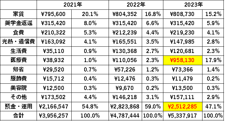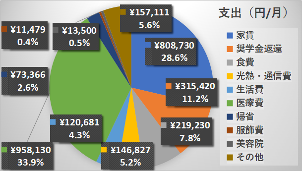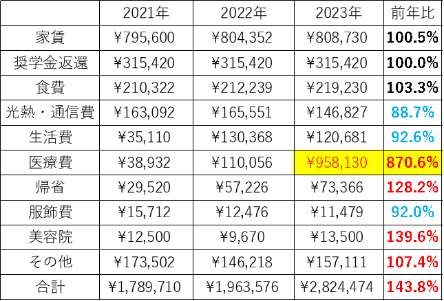 ということで、支出の合計は2,824,474円でした。昨年から40%以上増えており、3年ぶりに年間200万円以上(過去最高の支出)となりました。月平均に換算すると約23.5万円をということになりました。