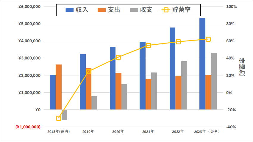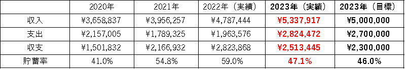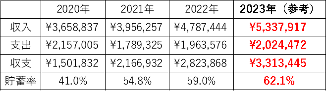 2018年は、学生の期間も含むので参考になってしまいますが、新生活の準備等もあり収支はマイナスでした。しかし、2019年以降は収支がプラスになり、年々その収支は増えていて、2021年では200万超、2022年では300万円近くまで収支をプラスにすることができましたが、2023年は収支が250万円程度・貯蓄率約47%、と社会人になってから初めての下落ということになりました。