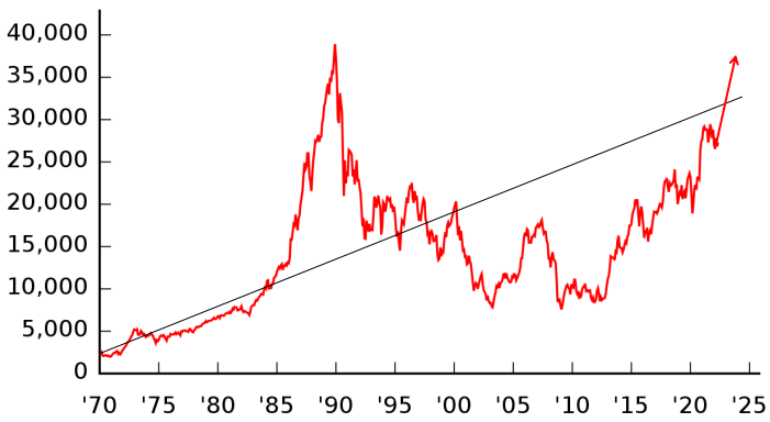 (私が勝手に引いた)直線のトレンドラインと最近の株価上昇を矢印で追加していますが、これを見ると1980年代後半がバブルで急上昇して、2000年頃にそれが戻りましたが、そこから2010年代前半までほとんど上昇せずに、2013年頃からアベノミクスでようやく復活してきたように見えます。