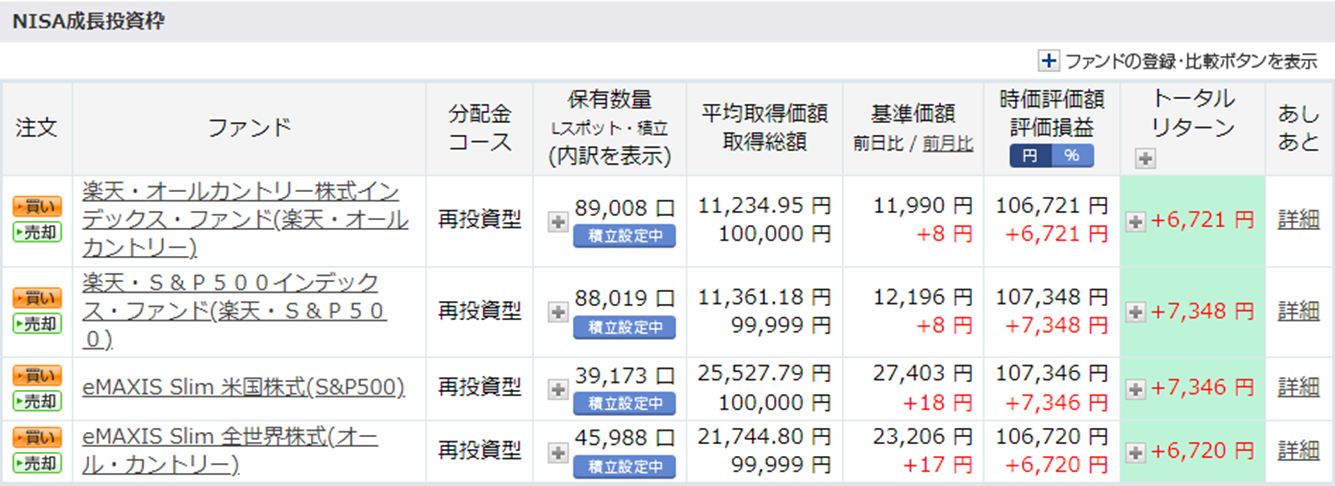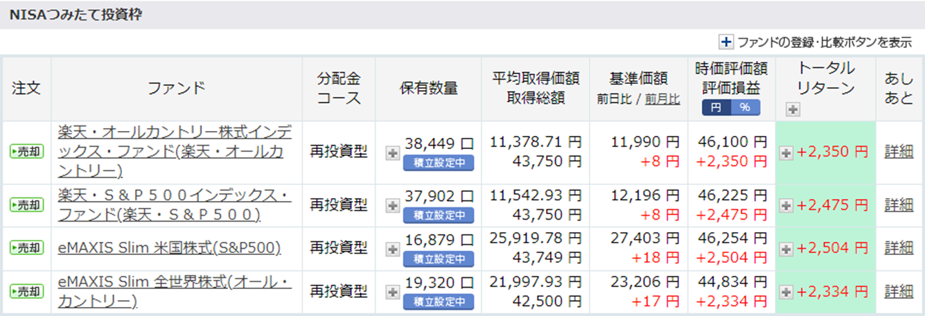 先月も引き続き相場の状況とドル円の影響で、順調にトータルリターンが伸びています。楽天とeMAXIS Slimで比較ができるように購入していますが、まだそれほど大きな差にはなっていないようです。