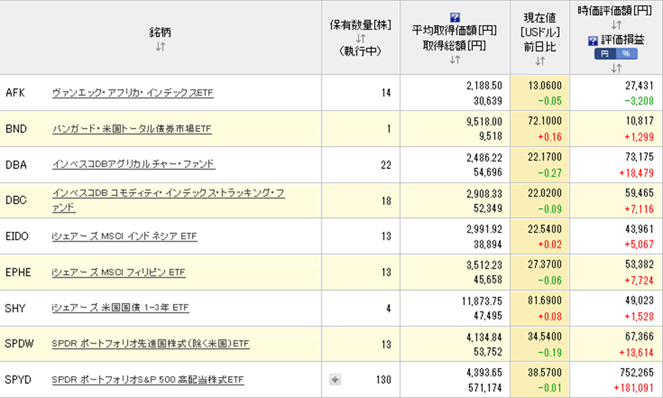 楽天証券の米国株のほとんどはSPYDです。(あくまで配当目当てですが。)含み益も出る上に、さらに配当もあれば気持ち的にはかなり安心です。私が運用している中で一番愛着があり、頑張ってほしいのがSPYDです。ETFの中で一番最初に購入を始めたものでもあります。