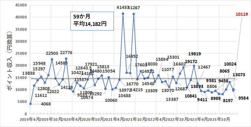 というわけで、2019年5月(月途中から始めたため参考データ)、2020年4月、2023年5~11月2024年2月以外の計49か月間において、月間10,000円分以上のポイント獲得を達成しています。